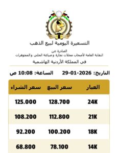 وبحسب التسعيرة اليومية بلغ سعر بيع غرام الذهب عيار 21، الأكثر طلبا لدى المواطنين في السوق المحلية، 112.80 دينارا لغايات البيع من محالّ الصاغة، مقابل 108.20 دنانير للشراء.