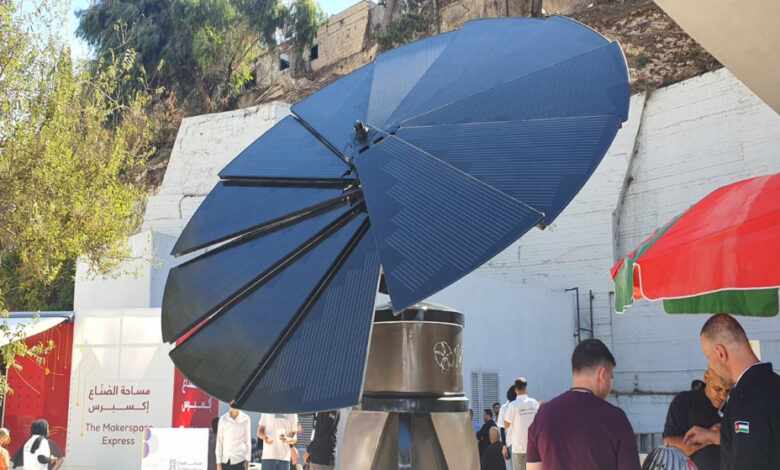 في ساحة خارجية على هامش انعقاد ملتقى الصناع بنسخته الثانية، الذي نظمته مؤسسة ولي العهد، يشاهد الزوار مجسمًا ضخمًا يحمل ألواحًا دائرية تنتظر شمس الصباح لتحولها إلى كهرباء تضيء عتمة البيوت وتقلل الكلف على الجيوب .