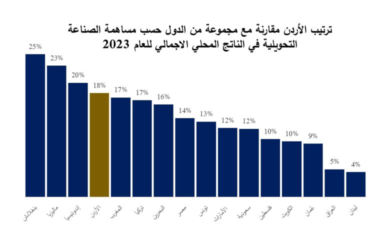 أكدت غرفة صناعة الأردن، أن الأردن احتل المرتبة الأولى عربيا والـ27 عالميا في مساهمة الصناعات التحويلية بالناتج المحلي الإجمالي.