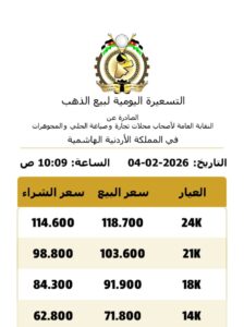 وأظهرت نشرة النقابة أن أسعار الذهب من الأعيرة الأخرى ارتفعت بدورها، إذ بلغ سعر بيع غرام الذهب عيار 24، الأربعاء، 118.7 دينارا مقابل 115 دينارا الثلاثاء، فيما ارتفع عيار 18 إلى 91.9 دينارا مقارنة مع 89.40 دينارا، وعيار 14 إلى 71.8 دينارا مقابل 69.60 دينارا في التسعيرة السابقة.