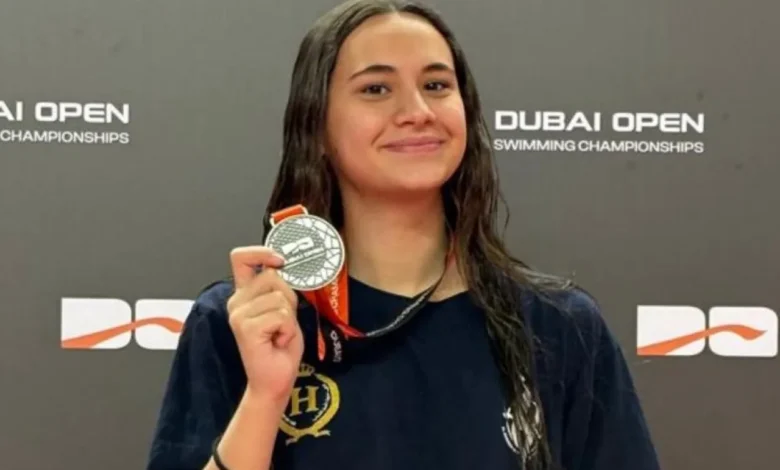 أحرزت السباحة لين عمر العبداللات (15 عامًا) الميدالية الفضية في سباق 100 متر صدر، ضمن بطولة دبي المفتوحة للسباحة 2026.
