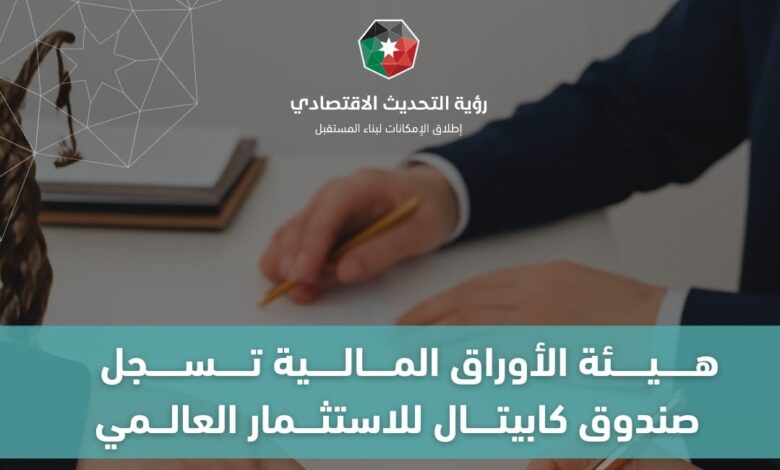 أعلنت هيئة الأوراق المالية الأردنية عن موافقة مجلس مفوضيها ،على تسجيل صندوق كابيتال للاستثمار العالمي الذي تم تأسيسه من قبل شركة المال الأردني للاستثمار والوساطة المالية.