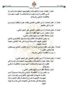 صدرت في الجريدة الرسمية اليوم قوانين “معدل لقانون المعاملات الإلكترونية” و”معدل لقانون الكاتب العدل” بعد توشحها بالإرادة الملكية السامية.