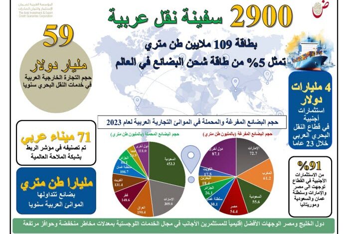 ورصد التقرير زيادة بمعدل 4 بالمئة في حجم الأسطول التجاري العربي ليبلغ 2900 سفينة وفق الملكية الفعلية للسفن عام 2025، بينما القدرة الاستيعابية لسفنه ارتفعت بمعدل 4.6 بالمئة لتبلغ نحو 109 ملايين طن متري من الوزن الساكن عام 2025، بحصة بلغت 5 بالمئة من حجم الشحن العالمي.