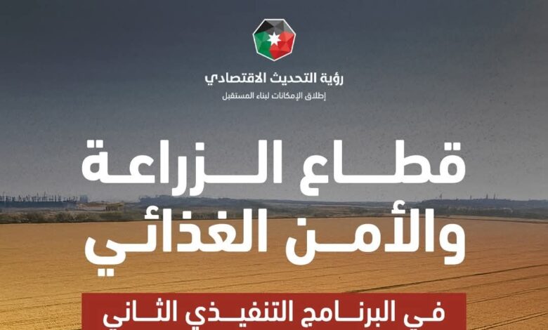أطلقت الحكومة حزمةً من المبادرات الاستراتيجية ضمن البرنامج التنفيذي الثاني لرؤية التحديث الاقتصادي (2026–2029)، شملت قطاع الزراعة والأمن الغذائي تحت محرك “الصناعات عالية القيمة”، بهدف دعم البحث والتطوير والابتكار، والتوسع في استخدام التقنيات الحديثة، وتعزيز تنافسية الأردن عالميًا، ورفع كفاءة منظومة الأمن الغذائي الوطني.