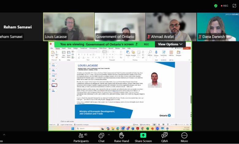 كما تضمّن البرنامج عرضاً تحليلياً لسوق تكنولوجيا المعلومات والاتصالات في مقاطعة أونتاريو، قدّمه المستشار القطاعي الأول في وزارة التنمية الاقتصادية وخلق فرص العمل والتجارة في أونتاريو، “كودا وامامبو ” حيث استعرض فرص السوق ونماذج التعاون المحتملة مع الشركات الأردنية. وأوضح أن البرنامج الذي تمثله الوزارة يركّز على مساعدة شركات أونتاريو على زيادة صادراتها وتعزيز التجارة الثنائية مع دول العالم، من خلال حزمة متكاملة من الخدمات التي تبدأ بالاستشارات السوقية ومواجهة تحديات الدخول إلى الأسواق، وتمتد إلى تنظيم بعثات تجارية داخلية وخارجية، وعقد ندوات ومؤتمرات واجتماعات افتراضية، إضافة إلى المشاركة في كبرى الفعاليات الدولية عبر أجنحة رسمية لأونتاريو.